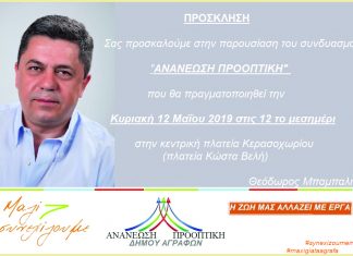 Κυριακή 12/5/2019 Κερασοχώρι (Πλατεία Κώστα Βελή) Παρουσίαση συνδυασμού ‘ΑΝΑΝΕΩΣΗ ΠΡΟΟΠΤΙΚΗ’ του υποψήφιου Δημάρχου Αγράφων Θεόδωρου Μπαμπαλή | Ώρα 12.00 μ.μ.