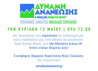 Κυριακή 12/5/2019 στην Αθήνα (Ξενοδοχείο ‘Royal Olympic Athens) Παρουσίαση συνδυασμού ‘ΔΥΝΑΜΗ ΑΝΑΝΕΩΣΗΣ’ σε ετεροδημότες του υποψήφιου Δημάρχου Καρπενησίου Νικόλαου Σουλιώτη | Ώρα 12.00 μ.μ.