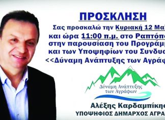 Κυριακή 12/5/2019 στο Ραπτόπουλο Παρουσίαση συνδυασμού ‘ΔΥΝΑΜΗ ΑΝΑΠΤΥΞΗΣ ΤΩΝ ΑΓΡΑΦΩΝ’ σε ετεροδημότες του υποψήφιου Δημάρχου Αγράφων Αλέξη Καρδαμπίκη | Ώρα 11.00 π.μ.