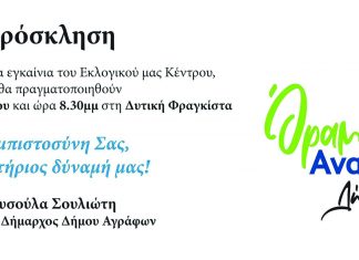 Παρασκευή 10/5/2019 Δυτική Φραγκίστα Παρουσίαση συνδυασμού ‘ΟΡΑΜΑ ΑΝΑΓΕΝΝΗΣΗΣ’ της υποψήφιας Δημάρχου Αγράφων Χρυσούλας Σουλιώτη | Ώρα 20.00 μ.μ.