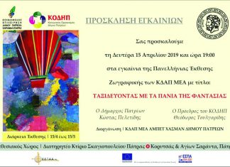 Δευτέρα 15/4/2019 στην Πάτρα (Σκαγιοπούλειο) θα πραγματοποιηθεί Έκθεση Ζωγραφικής ‘ΤΑΞΙΔΕΥΟΝΤΑΣ ΜΕ ΤΑ ΠΑΝΙΑ ΤΗΣ ΦΑΝΤΑΣΙΑΣ’ με τη συμμετοχή του ΚΔΑΠ ΜΕΑ Καρπενησίου...