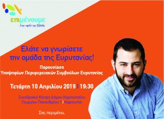 Τετάρτη 10/4/2019 στο Καρπενήσι (Συνεδριακό Κέντρο) θα πραγματοποιηθεί Παρουσίαση συνδυασμού. Ο Υποψήφιος Περιφερειάρχης Στερεάς Ελλάδας κ. Φάνης Σπανός, παρουσιάζει τους υποψηφίους του συνδυασμού ‘Επιμένουμε...