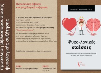 Δευτέρα 21/1/2019 στο Καρπενήσι (Δημόσια Κεντρική Βιβλιοθήκη) ‘Ψυχο- λογικές Σχέσεις’. Παρουσίαση Βιβλίου και Ψυχολογική Συζήτηση. Διαδραστική παρουσίαση και Σεμινάριο Αυτογνωσίας βασισμένο στο best- seller...
