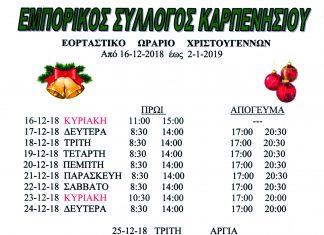 Ανακοινώθηκε το Εορταστικό Ωράριο του Εμπορικού Συλλόγου Καρπενησίου