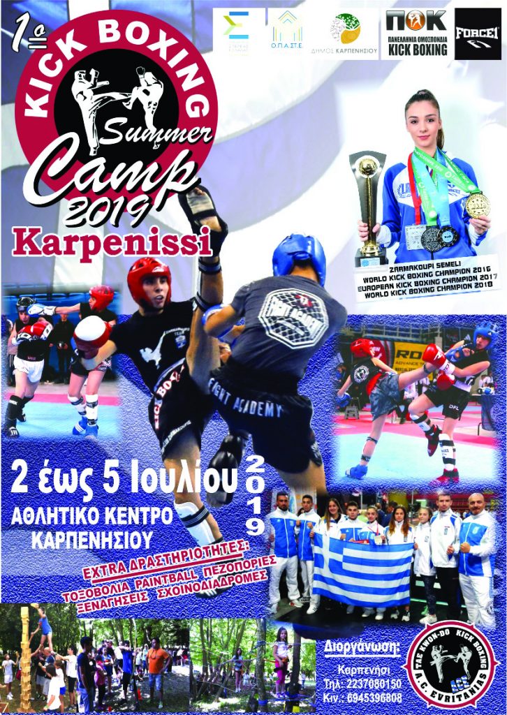 Το καμπθα θα λάβει μέρος από 2 έως 5 Ιουλίου στην όμορφη πρωτεύουσα της Ευρυτανίας το Καρπενήσι! Με συμμετοχές από όλη την Ελλάδα και το εξωτερικό με πρωταθλητές που συμμετέχουν ήδη στην εθνική ομάδα με δυνατές προπονήσεις και πολλά sparring για όλες τις ηλικίες και όλα τα επίπεδα καθώς θα χωριστούν σε ανάλογα τμήματα cadet-junior και kids !Το καμπ θα συνδιοργανωθεί με την Περιφέρεια (Ο.Π.Α.ΣΤ.Ε) και τον Δήμο Καρπενησίου, και πάντα με την υποστήριξη της Π.Ο.Κ. Πανελληνίας Ομοσπονδίας ΚΙΚ ΜΠΟΞΙΝΚ και της FORCE1.