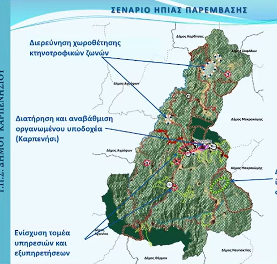 Συγκεκριμένα το σχέδιο προβλέπει ως προς τον πρωτογενή τομέατην χωροθέτησης των τροφικών ζωνών νοτιοανατολικά του Καρπενησίουκαι προτείνεται η ίδρυση πρωτότυπης βιολογικής φάρμας τα ζώα θα ζουν στο φυσικό τους περιβάλλον, θα υπάρχουνκτίρια εκτροφής, αρμεκτήρια και παράλληλα θα μπορεί να υπάρξει και πρότυπο τυροκομείο για να παράγει γάλα, με στόχο η μονάδα να αποτελέσει πόλο αγροτουριστικής ανάπτυξης.