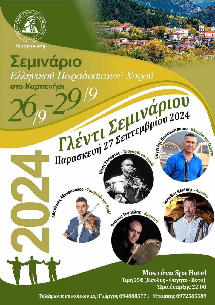 Για 4 ημέρες, από την Πέμπτη 26 έως την Κυριακή 29 Σεπτεμβρίου, ο Πολιτιστικός Σύλλογος Καρπενησίου, διοργανώνει Σεμινάριο Ελληνικού Παραδοσιακού Χορού στο Καρπενήσι.Για όσους θέλουν μα μάθουν, να γνωρίσουν να γλεντήσουν και να γίνουν μια μεγάλη παρέα με την μεγάλη ‘‘χορευτική οικογένεια’’ του Πολιτιστικού Συλλόγου, μπορούν να συμμετέχουν σε αυτή την μοναδική χορευτική ευκαιρία. Εισηγητές του σεμιναρίου θα είναι αξιόλογοι χοροδιδάσκαλοι που θα ταξιδέψουν χορευτικά σε διάφορα μέρη της Ελλάδας, και συγκεκριμένα ο Χαράλαμπος Ντόκας από την Ευρυτανία, ο Χρήστος Άψης από την Αλμωπία, ο Γιώργος Πατζαρίδης από την Θράκη, ο Δήμος Γκίκας από την Δράμα. Θα παρουσιάσουν χορούς του Έβρου, της Βόρειας Θράκης, της Ευρυτανίας και Αλμωπίας, Σαρακατσάνικα και χοροί της Δράμας, και την Παρασκευή 27 Σεπτεμβρίου γλέντι με την ορχήστρα Επτάσημο και Ζαπάρτα. Η συμμετοχή στο γλέντι (συμπεριλαμβανομένου φαγητού και ποτού, κοστίζει 25,00 ευρώ- Montana Spa Hotel).