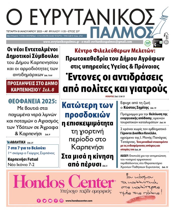 Πρωτοσέλιδα Στον Ευρυτανικό Παλμό που κυκλοφορεί Από Ευρυτανικός Παλμός - 8 Ιανουαρίου 2025 1924 FacebookTwitterLinkedinWhatsAppTelegramEmailΤυπώνω