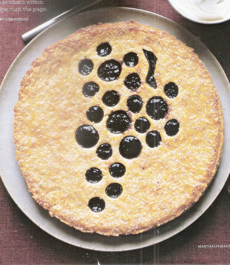 Για την μαρμελάδα: Ανακατεύουμε τα σταφύλια με το χυμό λεμόνι σε μια κατσαρόλα και βάζουμε πάνω σε δυνατή φωτιά. Ανακατεύοντας, συχνά, μέχρι τα σταφύλια να βγάλουν τα υγρά τους (7-8 λεπτά). Περνάμε το μείγμα από μια λεπτή σήτα. Ξαναβάζουμε το υγρό στην κατσαρόλα, σε μέτρια προς δυνατή φωτιά, προσθέτουμε τη ζάχαρη, 1 πρέζα αλάτι και περιμένουμε να πάρει βράση το μείγμα, ανακατεύοντας ελαφρά. Χαμηλώνουμε τη φωτιά και αφήνουμε το μείγμα να σιγοβράζει για περίπου 8 λεπτά μέχρι να δούμε ότι αρχίζει να δένει ελαφρά.  (Αν έχεις θερμόμετρο θα πρέπει να έχει θερμοκρασία 220°C). Βουτυρώνουμε την ταρτιέρα. Για την συναρμολόγηση σε μια ελαφρά αλευρωμένη επιφάνεια ανοίγεις το μεγαλύτερο κομμάτι ζύμης  και το στρώνεις πάνω στην έτοιμη ταρτιέρα. Κόβεις τις άκρες να μην περισσεύουν.  Ανοίγεις και το άλλο κομμάτι στη διάμετρο της ταρτιέρας. Πρώτα βγάζουμε το μικρότερο κομμάτι της ζύμης για να κάνουμε μπόλικες τρύπες στην επιφάνεια. Βάζουμε τη μαρμελάδα αφού έχει κρυώσει. Σκεπάζουμε με το έτοιμο κομμάτι, κλείνουμε καλά γύρω γύρω τις άκρες και περνάμε την επιφάνεια με το χτυπημένο αβγό και πασπάλισε με ζάχαρη. Την ξαναβάλε στο ψυγείο για 15 λεπτά, όσο προθερμαίνεις το φούρνο, στους 190°C. Φουρνίζουμε για 15 λεπτά. Βγάζουμε την ταρτιέρα από το φούρνο και την χτυπάμε ελαφρά πάνω σε μια διπλωμένη πετσέτα για να φύγει ο αέρας.  Ξαναβάζουμε στο φούρνο για ακόμα 15-20 λεπτά μέχρι να ροδίσει και να κάνει φουσκάλες η μαρμελάδα.